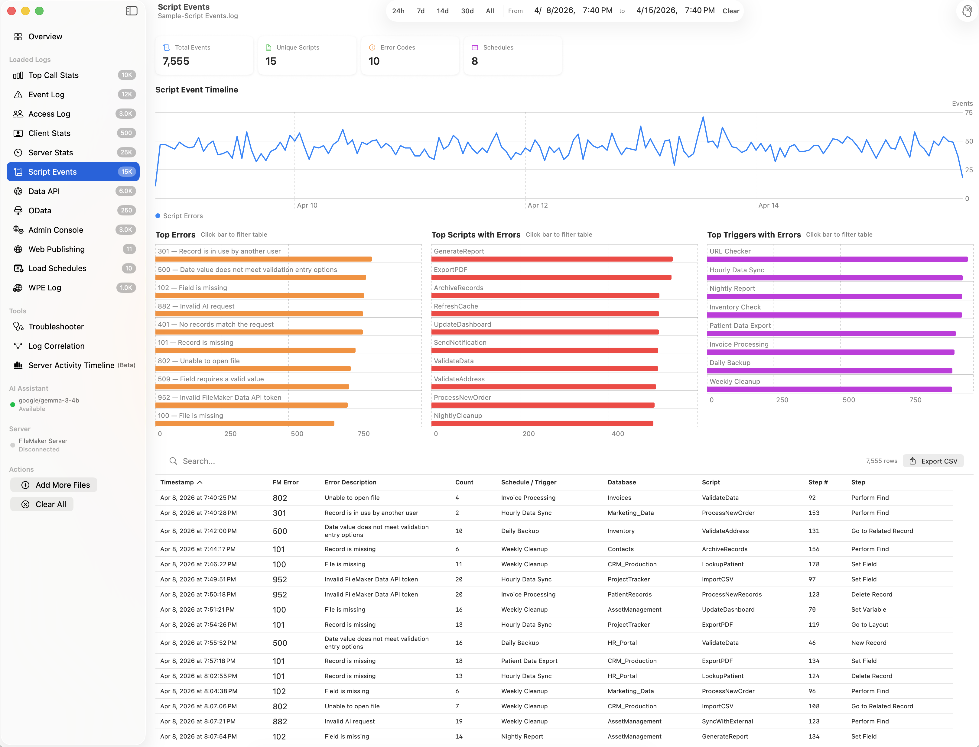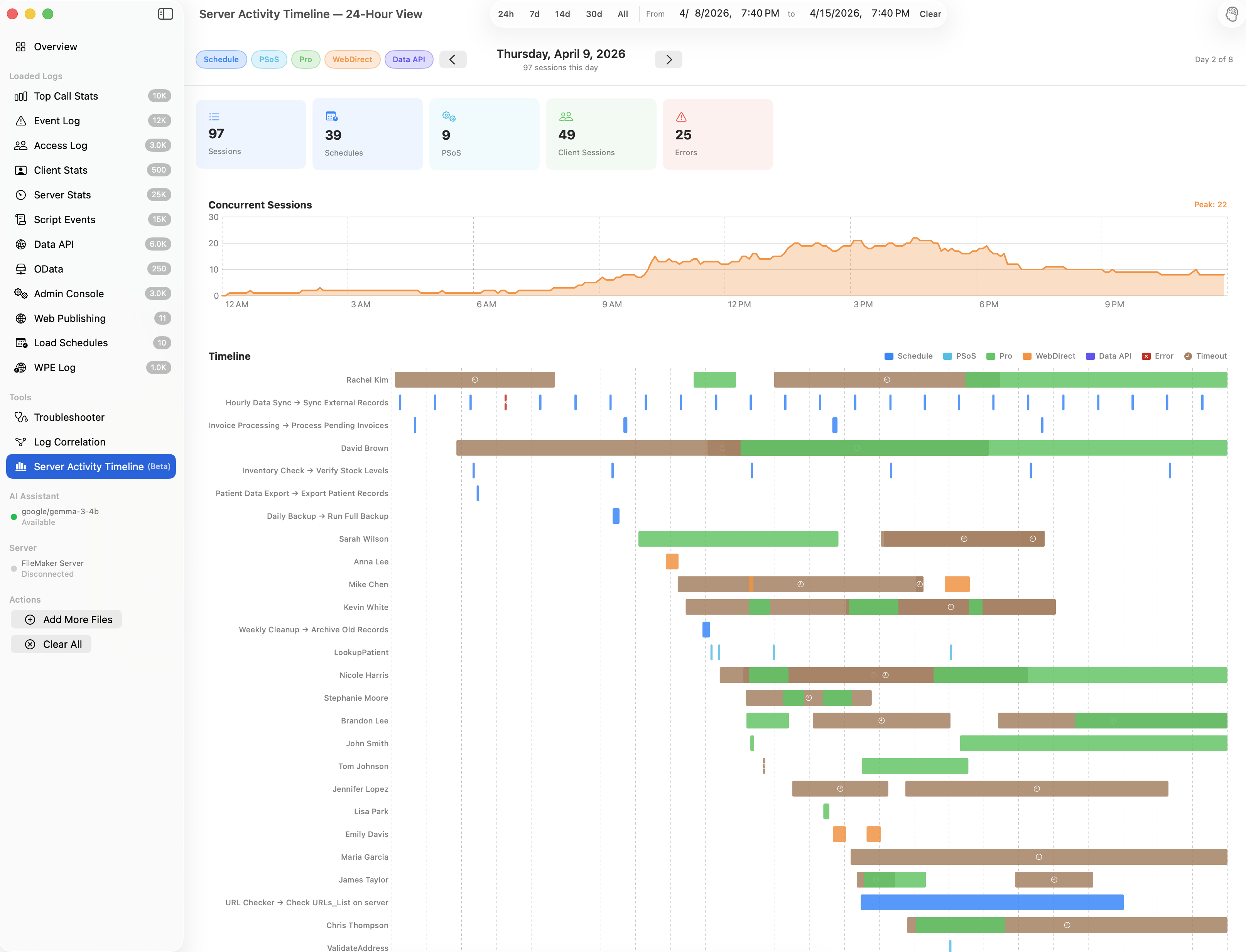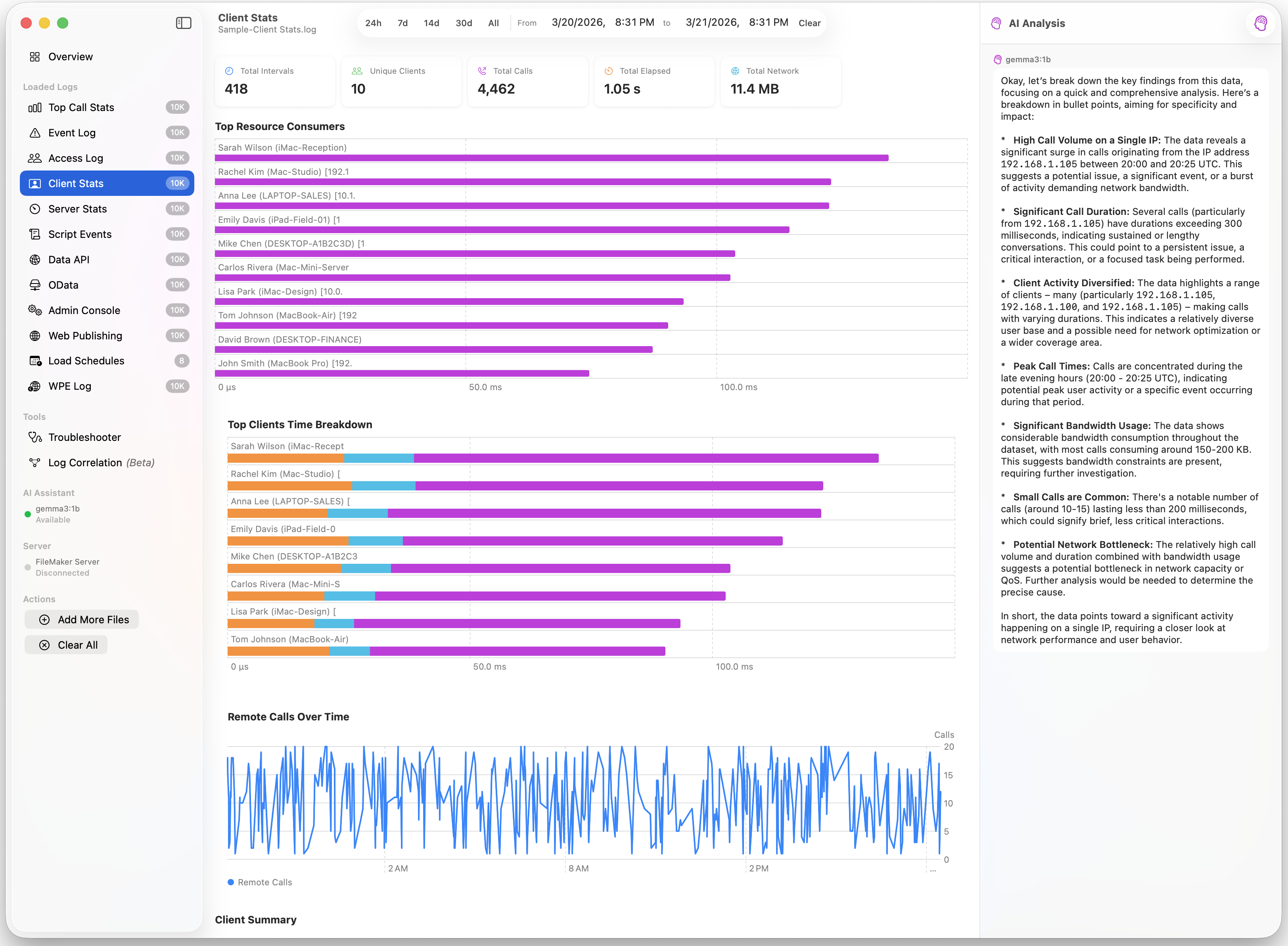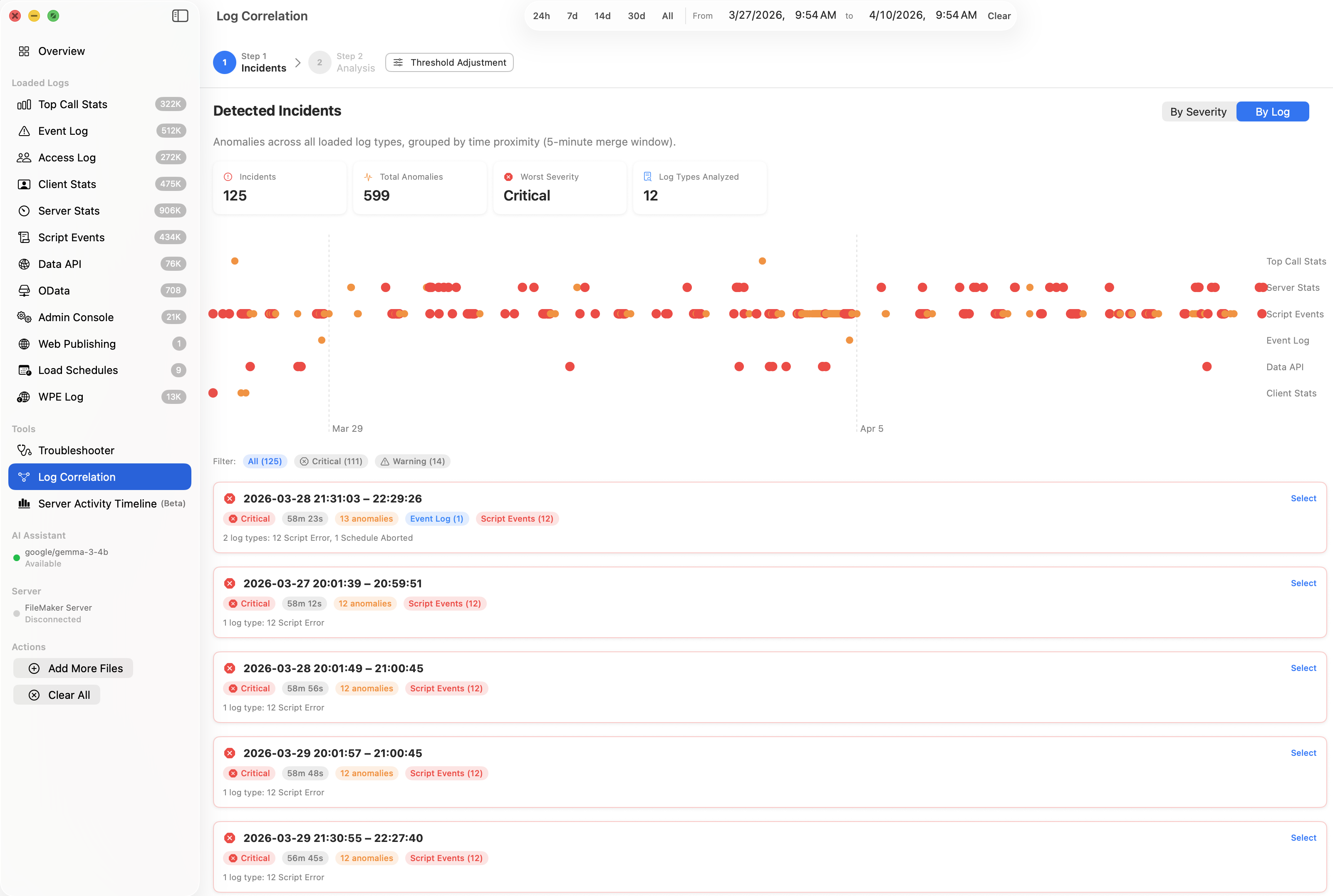 A native macOS app that parses, visualizes, and diagnoses performance issues across 12 FileMaker Server log types.