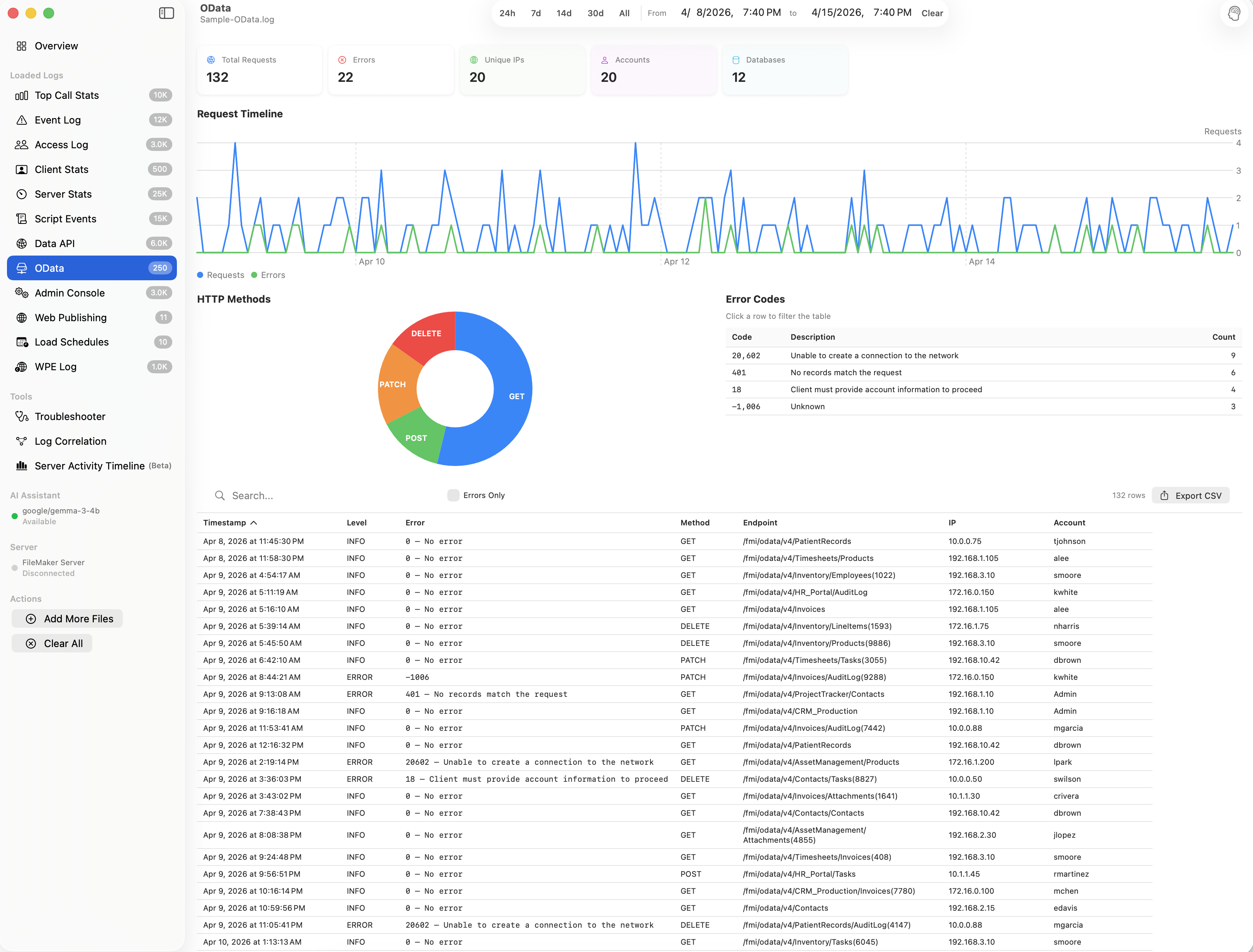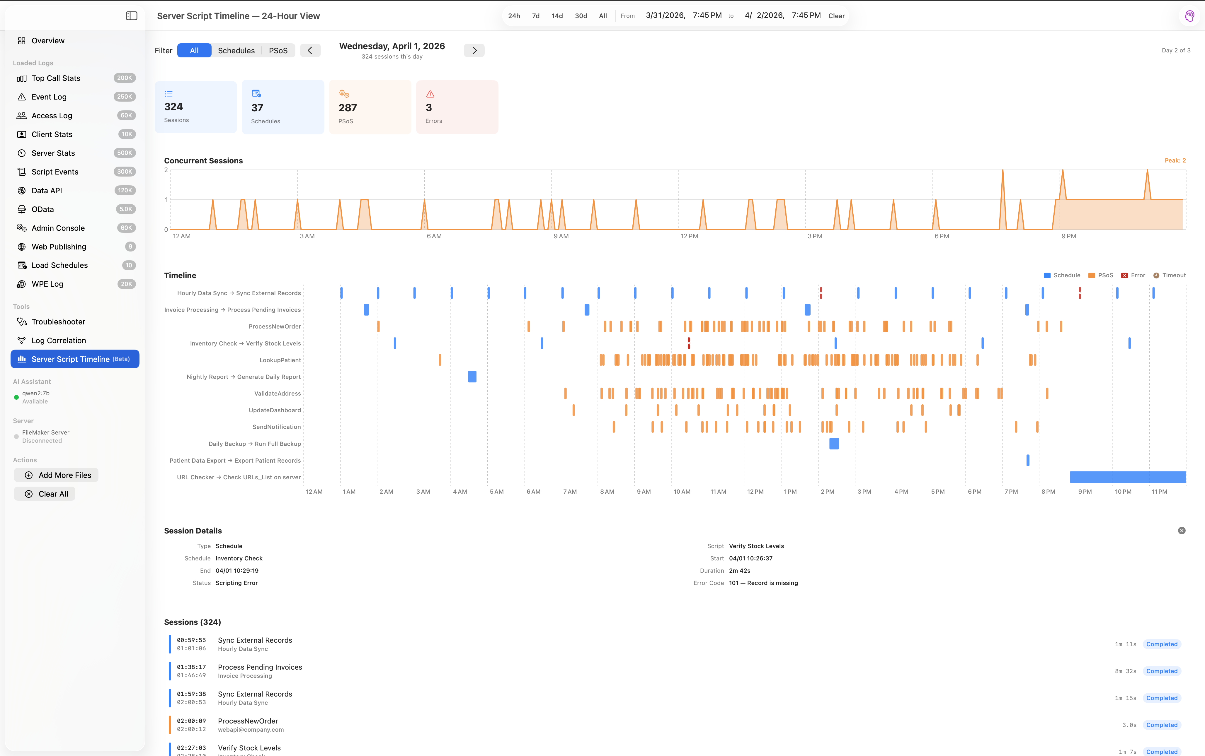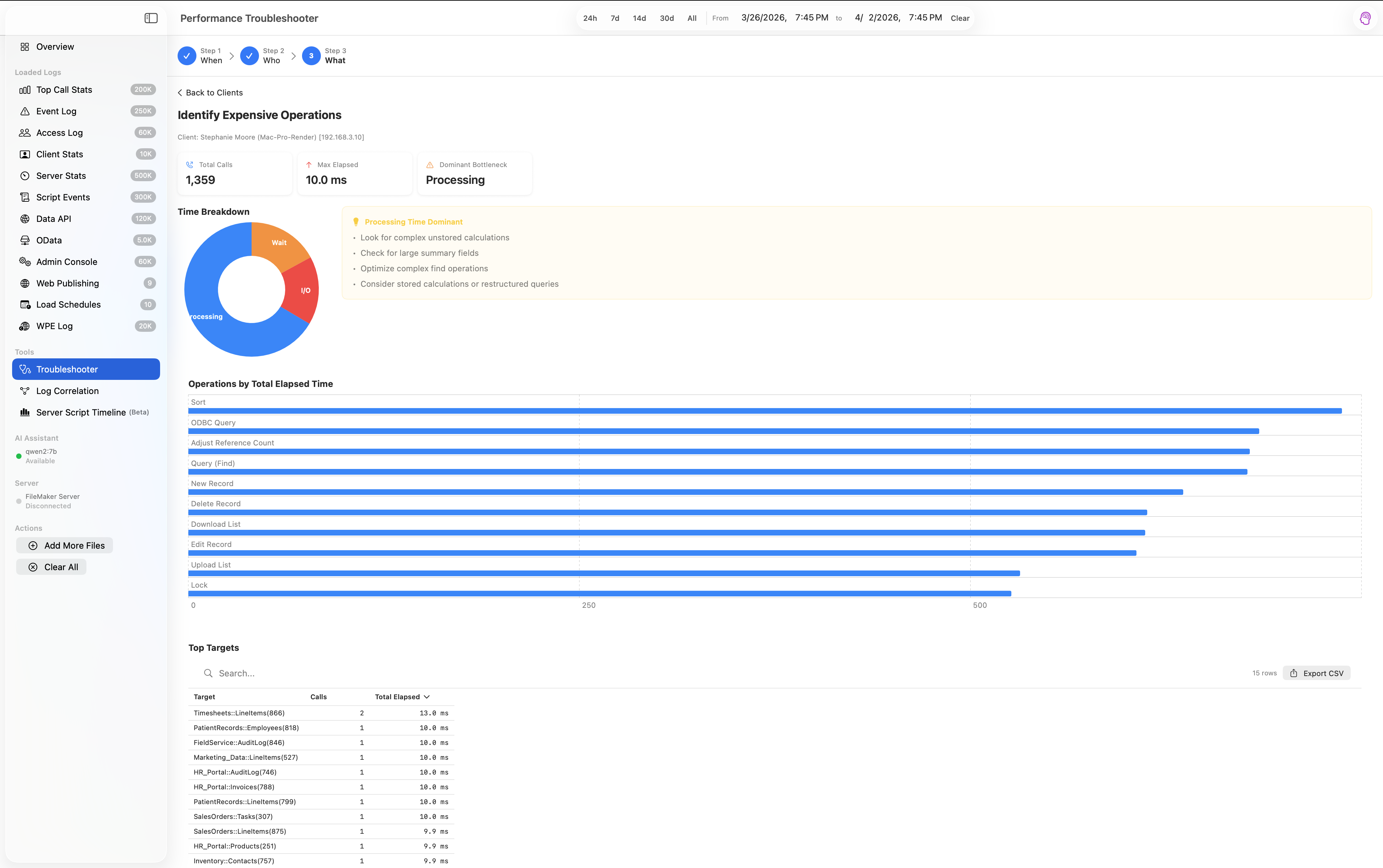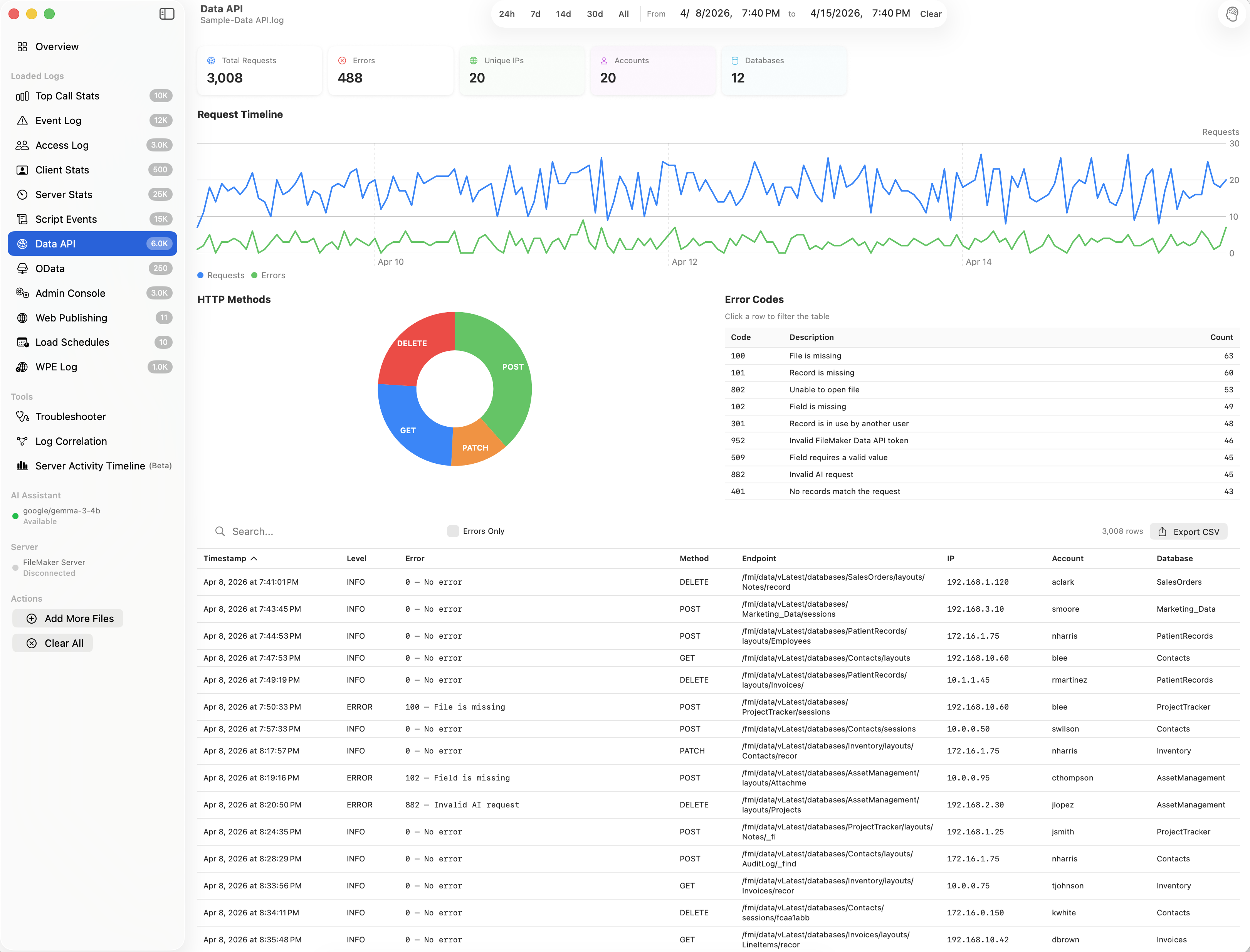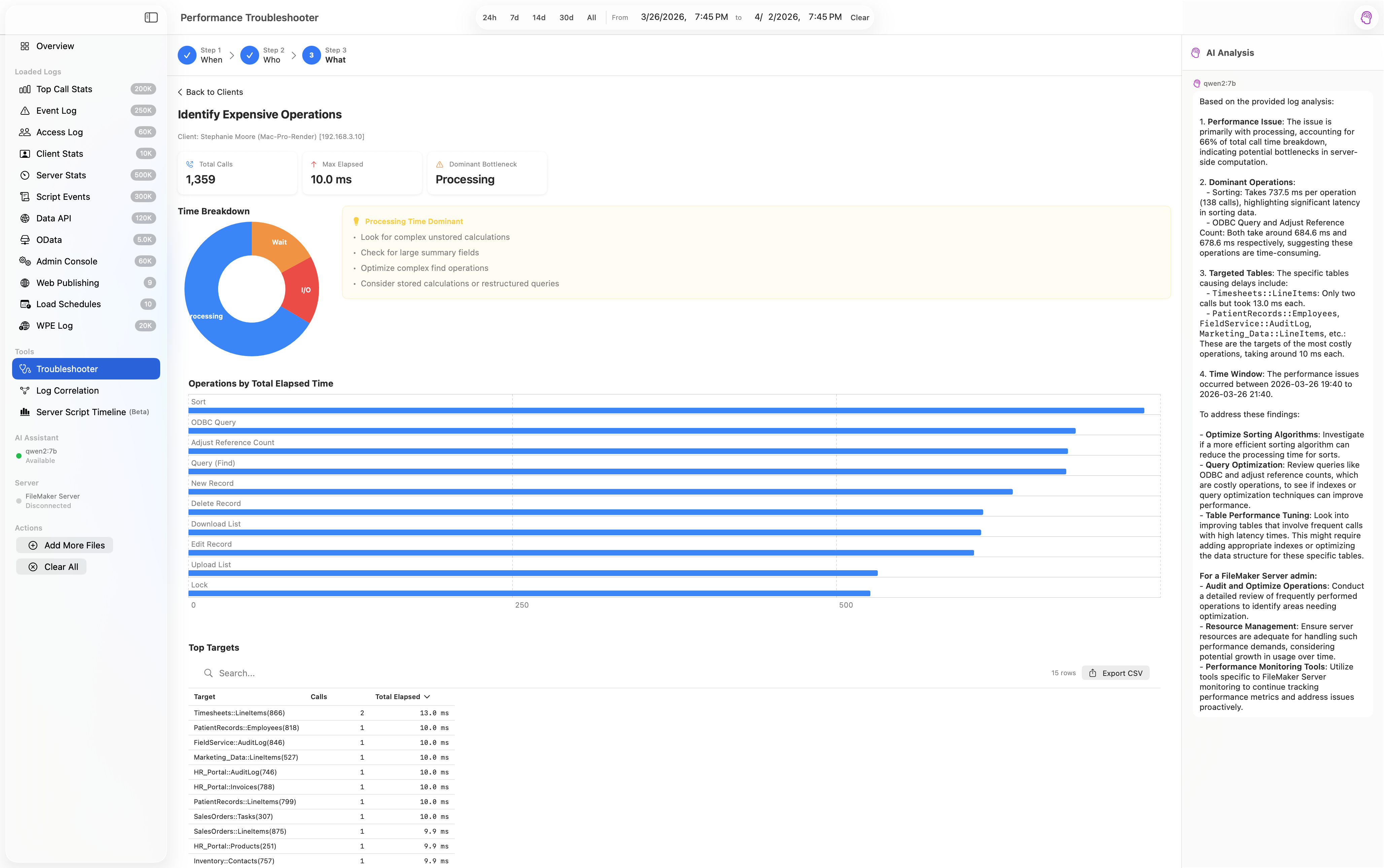 A native macOS app that parses, visualizes, and diagnoses performance issues across 12 FileMaker Server log types.