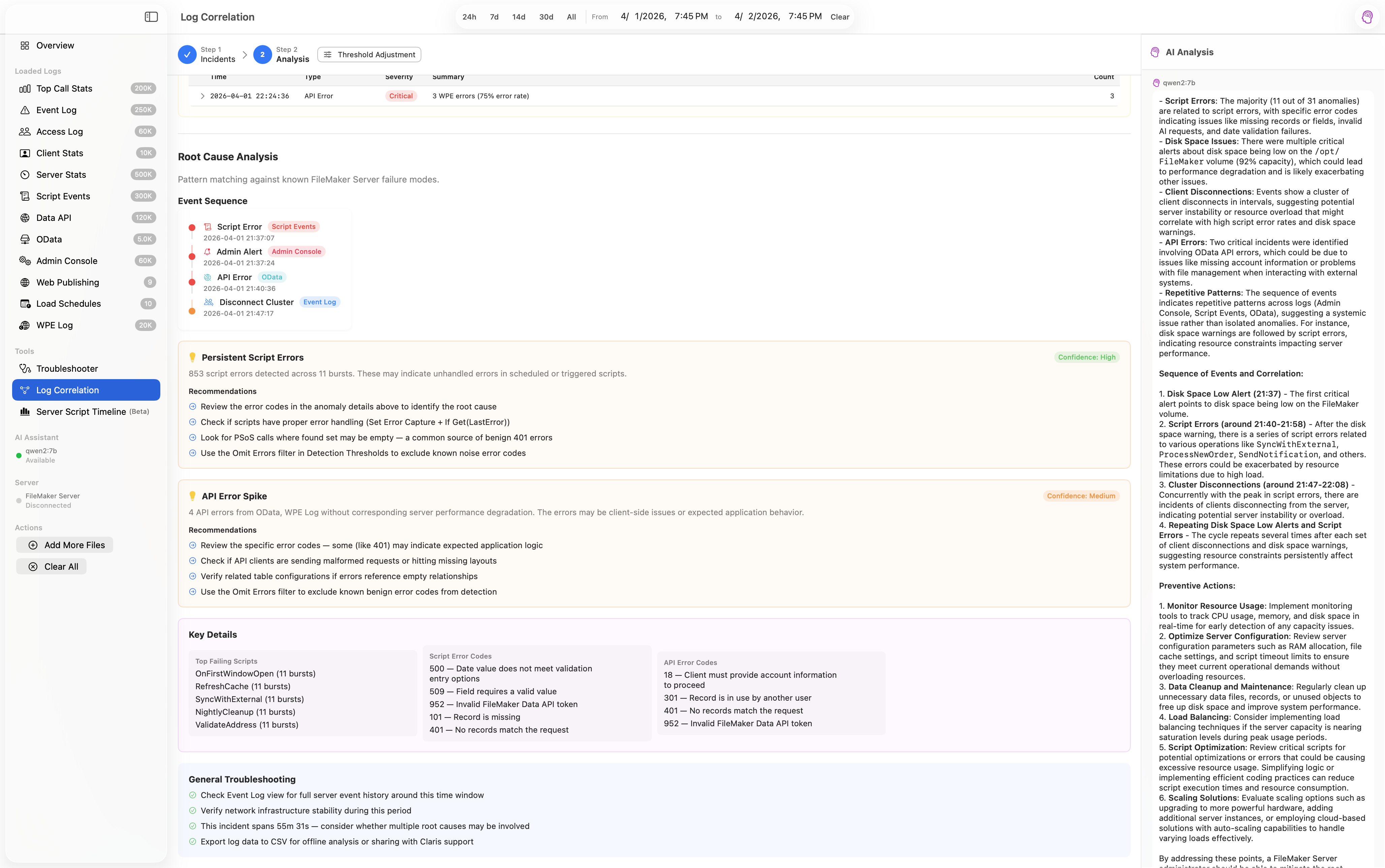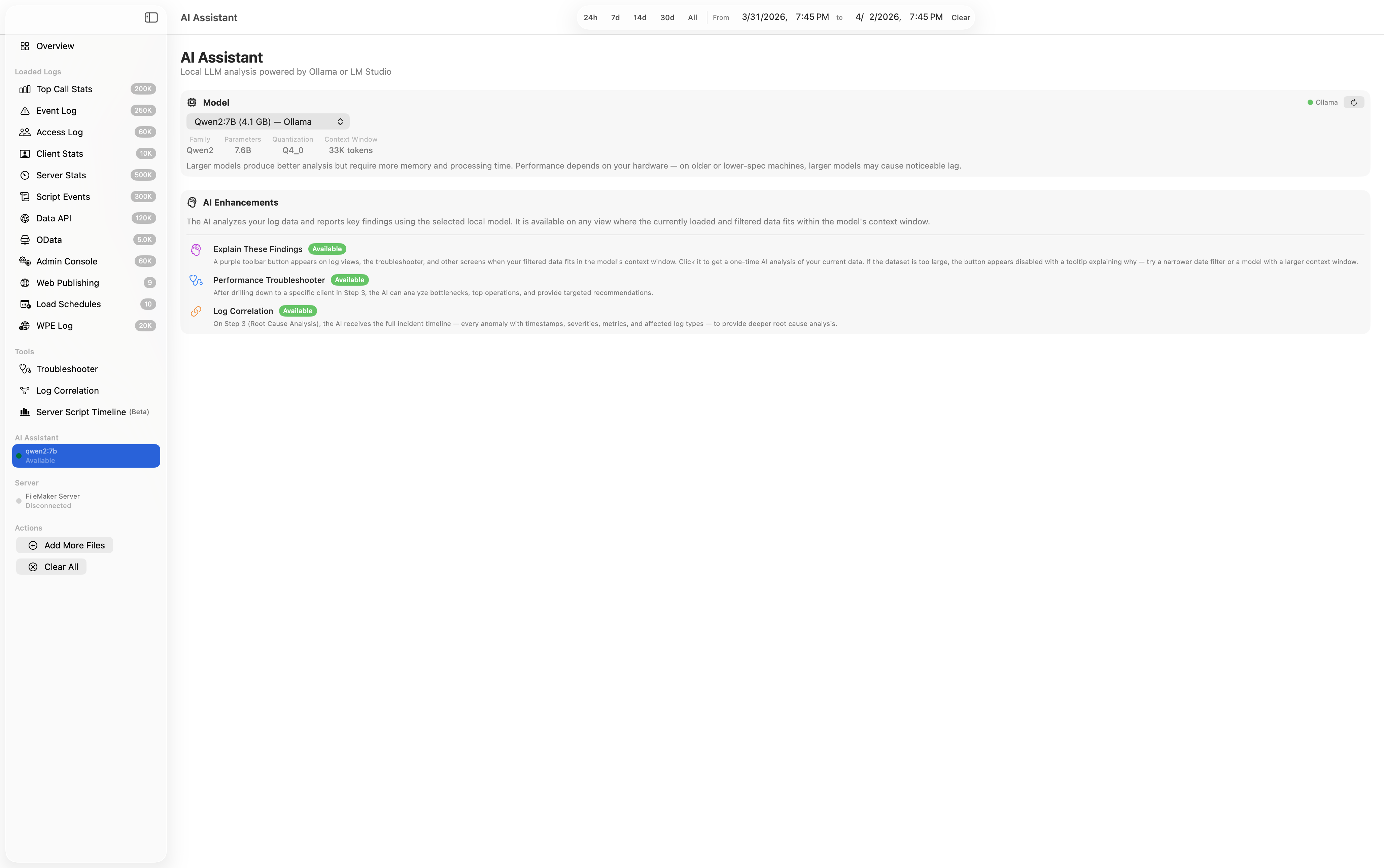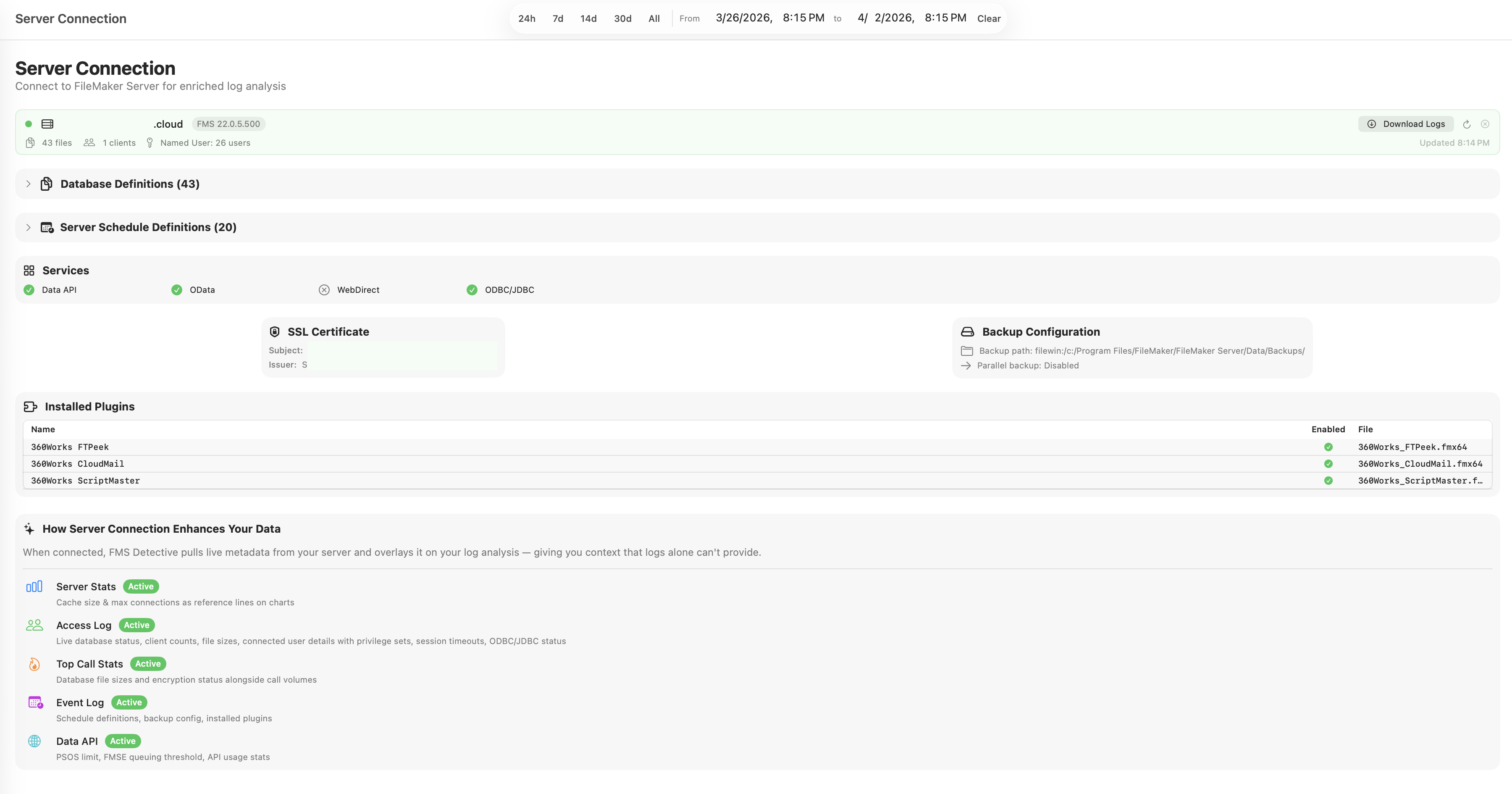 Optionally connect to your live FileMaker Server to enrich log analysis with real-time server context. Read-only access — no server settings are modified.