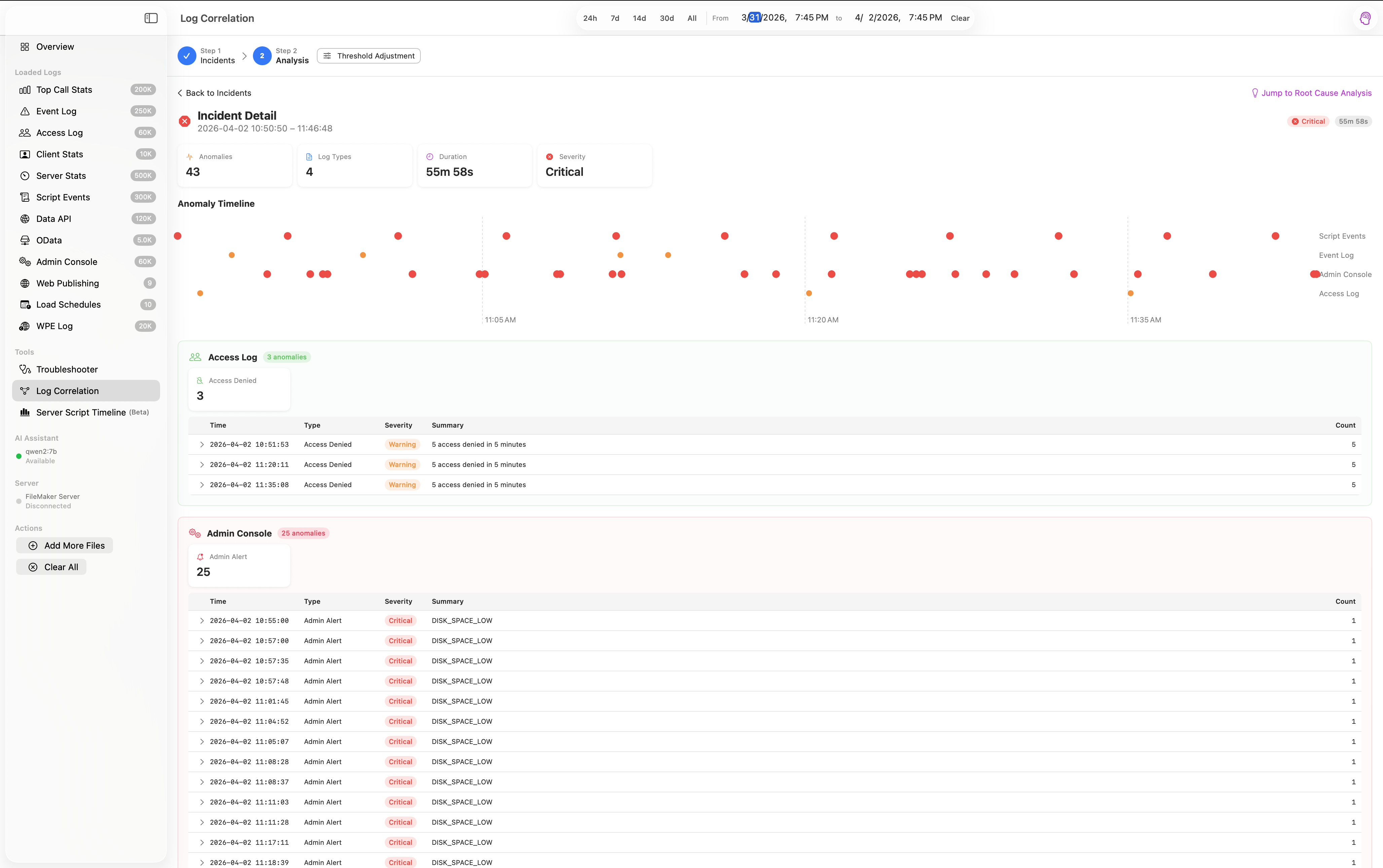Cross-log anomaly detection groups time-correlated issues into incidents with root cause analysis against known FMS failure modes.